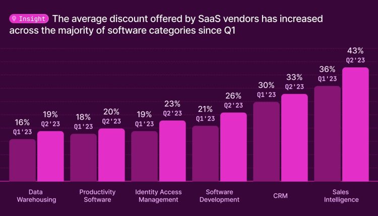 According to data from SaaS purchasing platform, Vertice, the average discount offered by SaaS vendors increased across the majority of software categories between Q1 and Q2 of 2023.